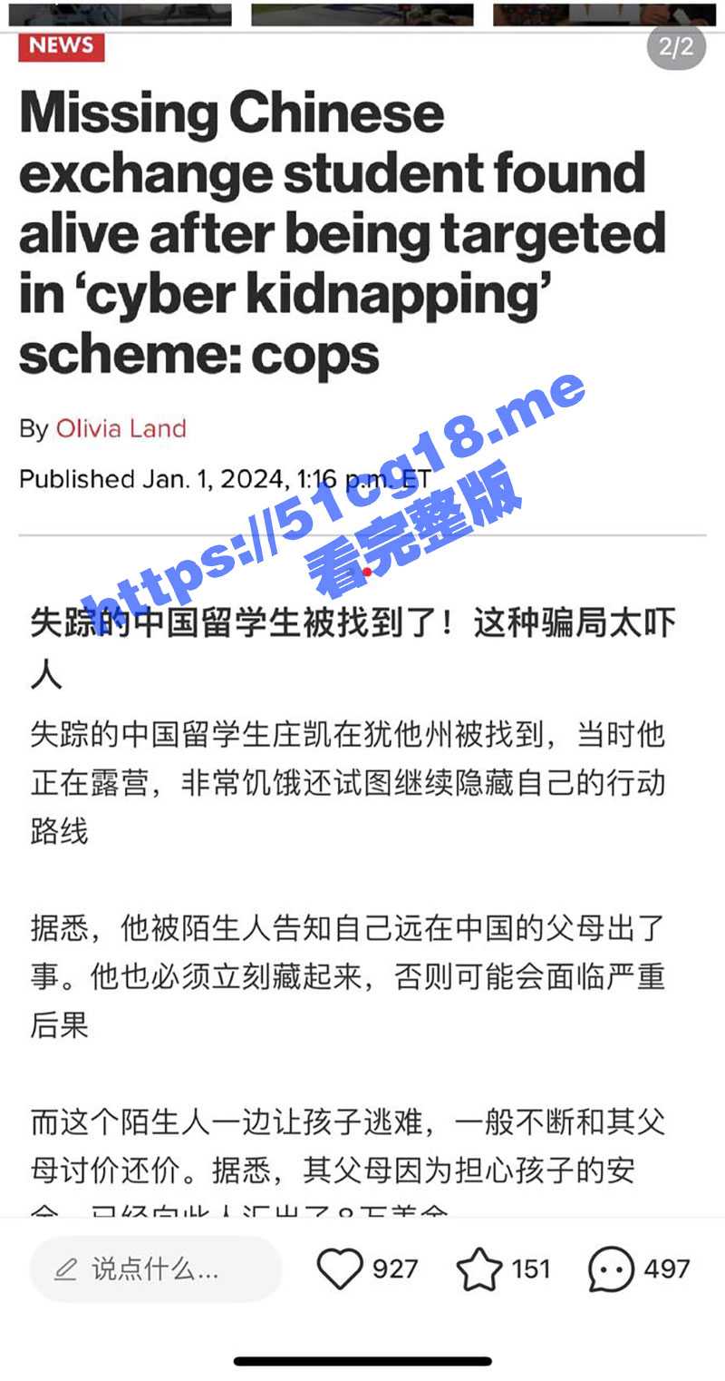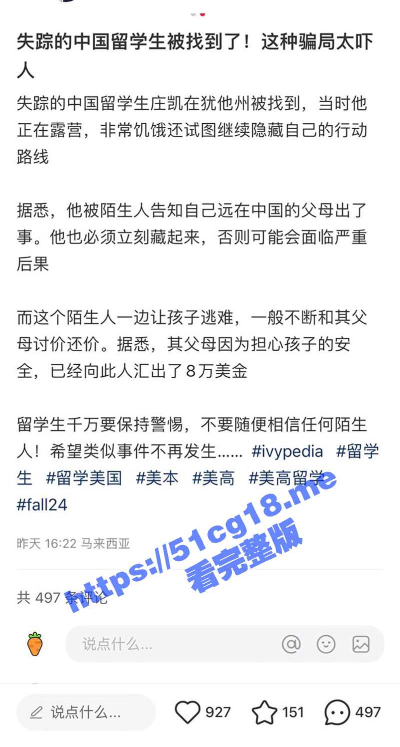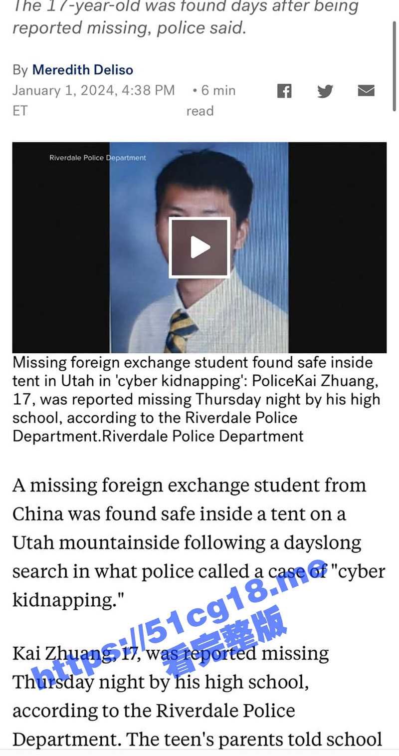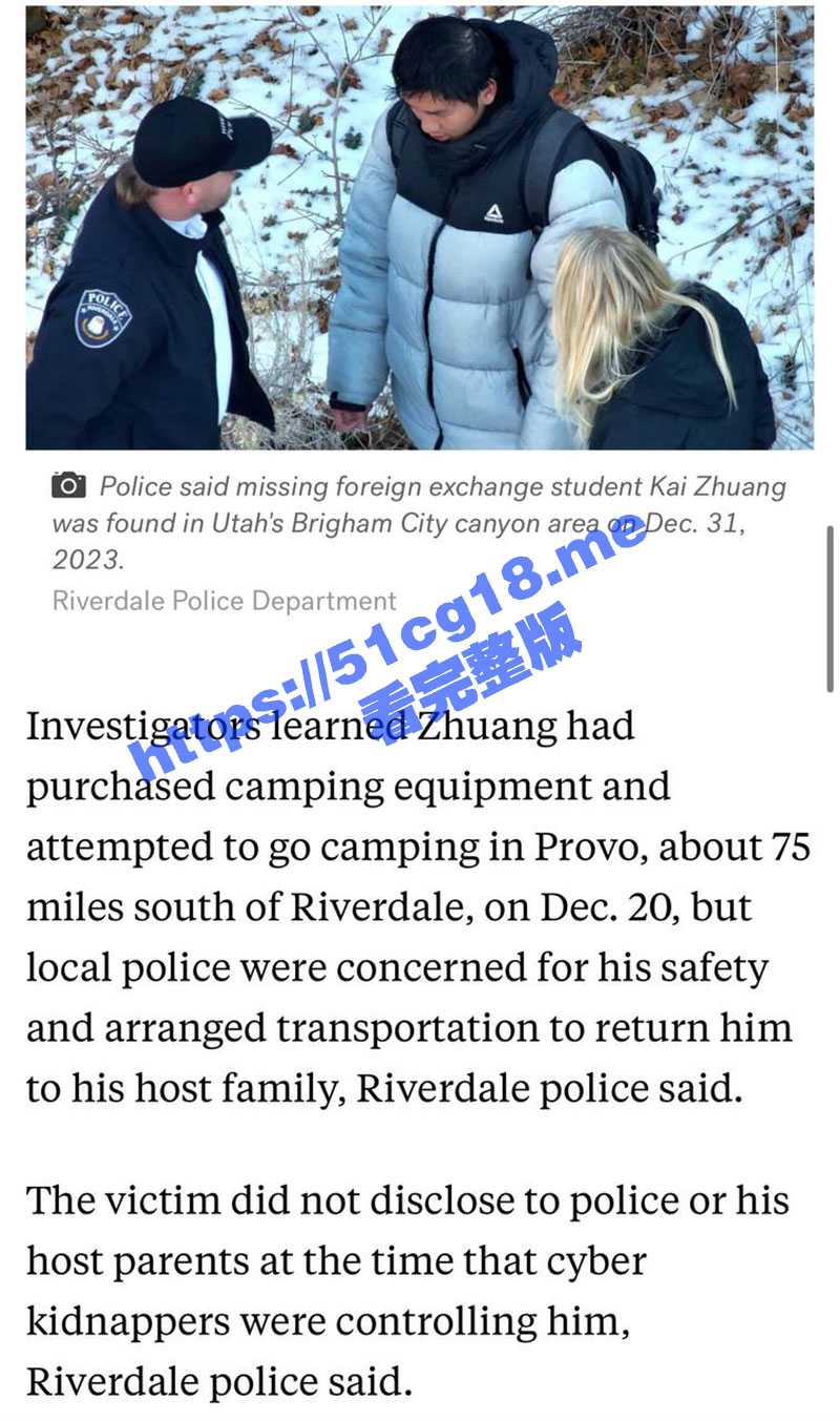 留学圈最近刚发生的大事件: 17岁留学生庄凯在美国犹他州的寄宿家庭里新年前夜被强行掳走,报警后在2024年初被当地警察和美国FBI在荒山中发现,独自一人躲在没有热源的小帐篷里。美国给的官方答复是这个男孩被网络绑架,被别人蒙骗威胁导致自己独自一人外出躲藏。卖肾听过,这次第一次听说卖jb,国内父母被敲诈,国外小孩被骗,相互利用。父母被敲诈8万刀,然后骗小孩说这是买他jb的钱,官方给出的数字也对的上了
