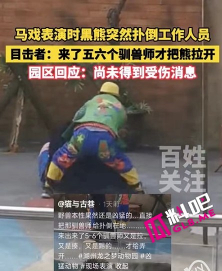 事件发生在黑熊表演进行到一半时。当时,黑熊正按照驯兽师的指令,用后脚站立在舞台上表演各种技巧,现场气氛热烈。然而,突然间,黑熊一个转身,猛地扑向了其中一名驯兽师。旁边的另一名驯兽师见状,立刻试图拉开黑熊,但由于力量悬殊,未能成功,驯兽师被按在地上,场面极为惊险。