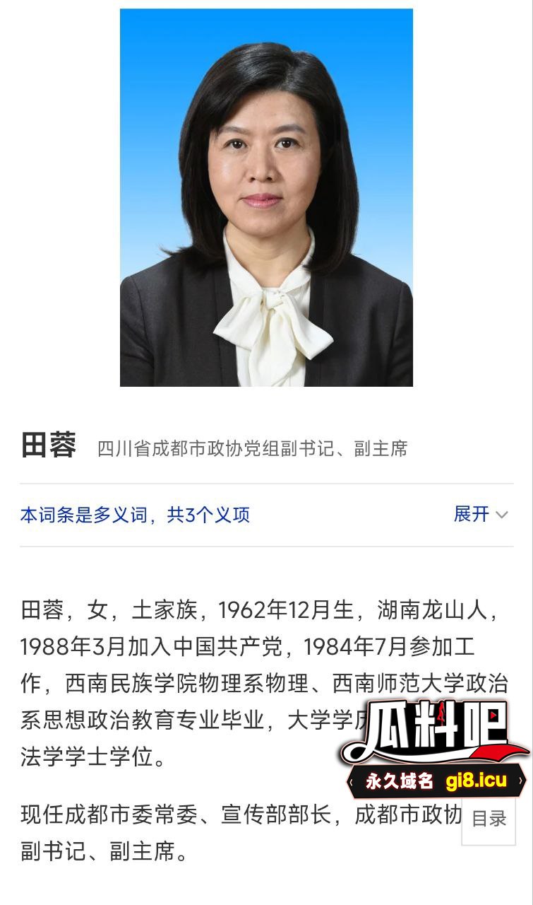 2月5日,在春节后首个工作日,四川省纪委监委发布消息,成都市政协党组副书记、副主席田蓉涉嫌严重违纪违法,目前正接受四川省纪委监委纪律审查和监察调查!这个人大家听名字不认识,但是说一件事,肯定就想起来她是谁了,之前谭谈交通的谭警官,就是拦了她的奔驰车后被封杀告老还乡~看起来还是风韵犹存的,年轻的时候绝对是有点姿色的,不然不能升这么快~网友们纷纷站队谭警官,说起谭警官还是比较幽默的哈,著名的二仙桥到成华大道,到现在都还记得呢~就是说嘛,怪不得升职那么快,原来是有口活和手法的呀~